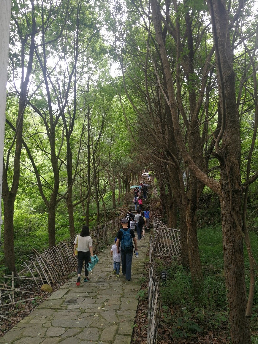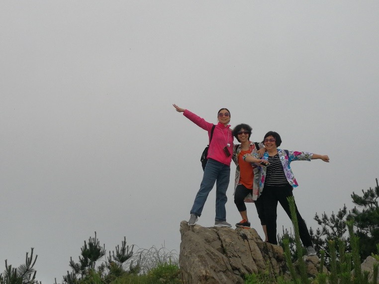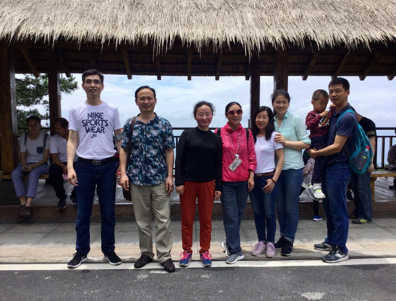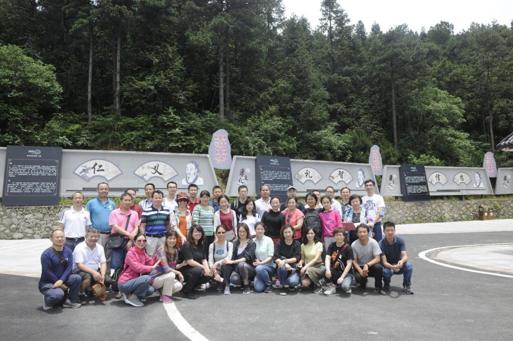 经过2个半小时车程,顺利到达双峰山森林公园。沿着蜿蜒的山路,六辆电瓶车承载着谈笑风生的可爱的老师们,抵达主峰脚下,老师们们兴致勃勃向主峰攀登。欢声笑语沿着山梁行进,愉快的气氛飘荡在幽静的山林。骄阳躲进云层,花鸟相伴左右。沿途风景秀美,不时跳出林立陡峭的怪石,忽现层叠葱郁的林木,身旁花香鸟语,碧水涌翠,美不胜收不知不觉间,登上了主峰的回宫阁,凭栏远眺,仙源美景目不暇接,无限风光尽收眼底,真恰似河流如束带,田舍若棋盘