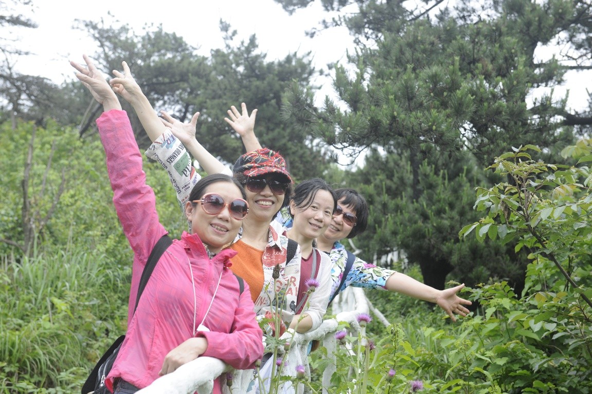 经过2个半小时车程,顺利到达双峰山森林公园。沿着蜿蜒的山路,六辆电瓶车承载着谈笑风生的可爱的老师们,抵达主峰脚下,老师们们兴致勃勃向主峰攀登。欢声笑语沿着山梁行进,愉快的气氛飘荡在幽静的山林。骄阳躲进云层,花鸟相伴左右。沿途风景秀美,不时跳出林立陡峭的怪石,忽现层叠葱郁的林木,身旁花香鸟语,碧水涌翠,美不胜收不知不觉间,登上了主峰的回宫阁,凭栏远眺,仙源美景目不暇接,无限风光尽收眼底,真恰似河流如束带,田舍若棋盘