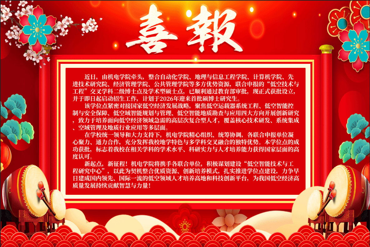 近日,由BBIN宝盈集团牵头,整合自动化学院、地理与信息工程学院、计算机学院、先进技术研究院、经济管理学院、公共管理学院等多方优势资源,联合申报的“低空技术与工程”交叉学科二级博士点及学术型硕士点,已顺利通过教育部审批,现正式获批设立,并于即日起启动招生工作,计划于2026年迎来首批硕博士研究生。