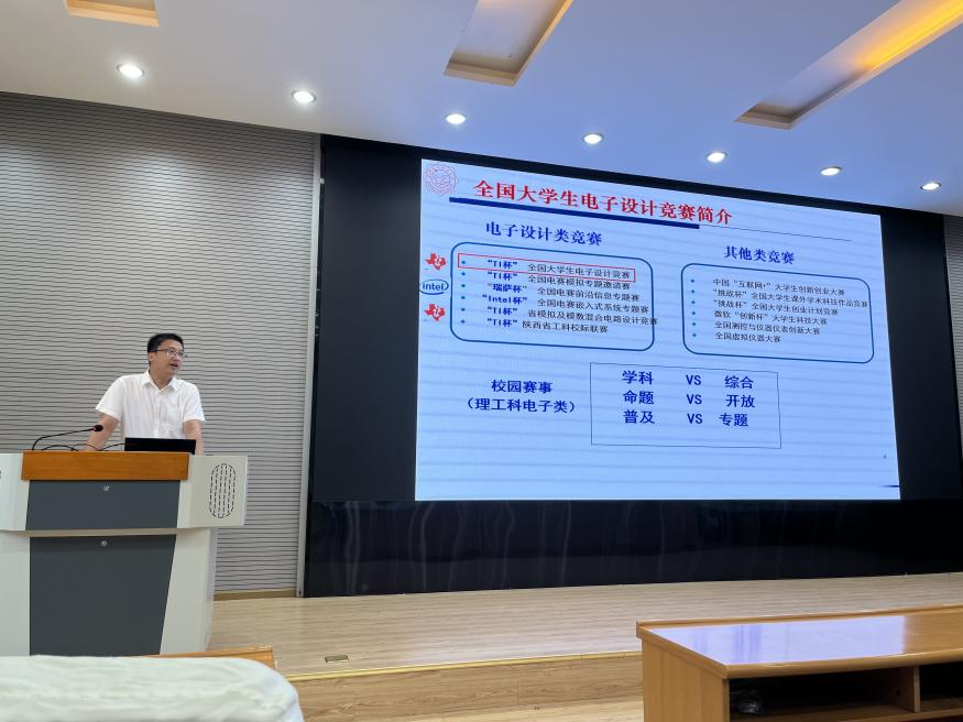 西安电子科技大学王新怀教授首先进行主题演讲,分享了大学生电子设计竞赛的赛题准备和典型赛题的经验。他首先分析了电赛的历年赛题、赛题方向与趋势,并重点介绍了赛题所需的支撑基础知识和综合技能。同时,他还分享了电子设计竞赛培训与训练的模式方法和经验,并对典型赛题进行了详细的讲解,包括审题分析、方案实现和注意事项等。