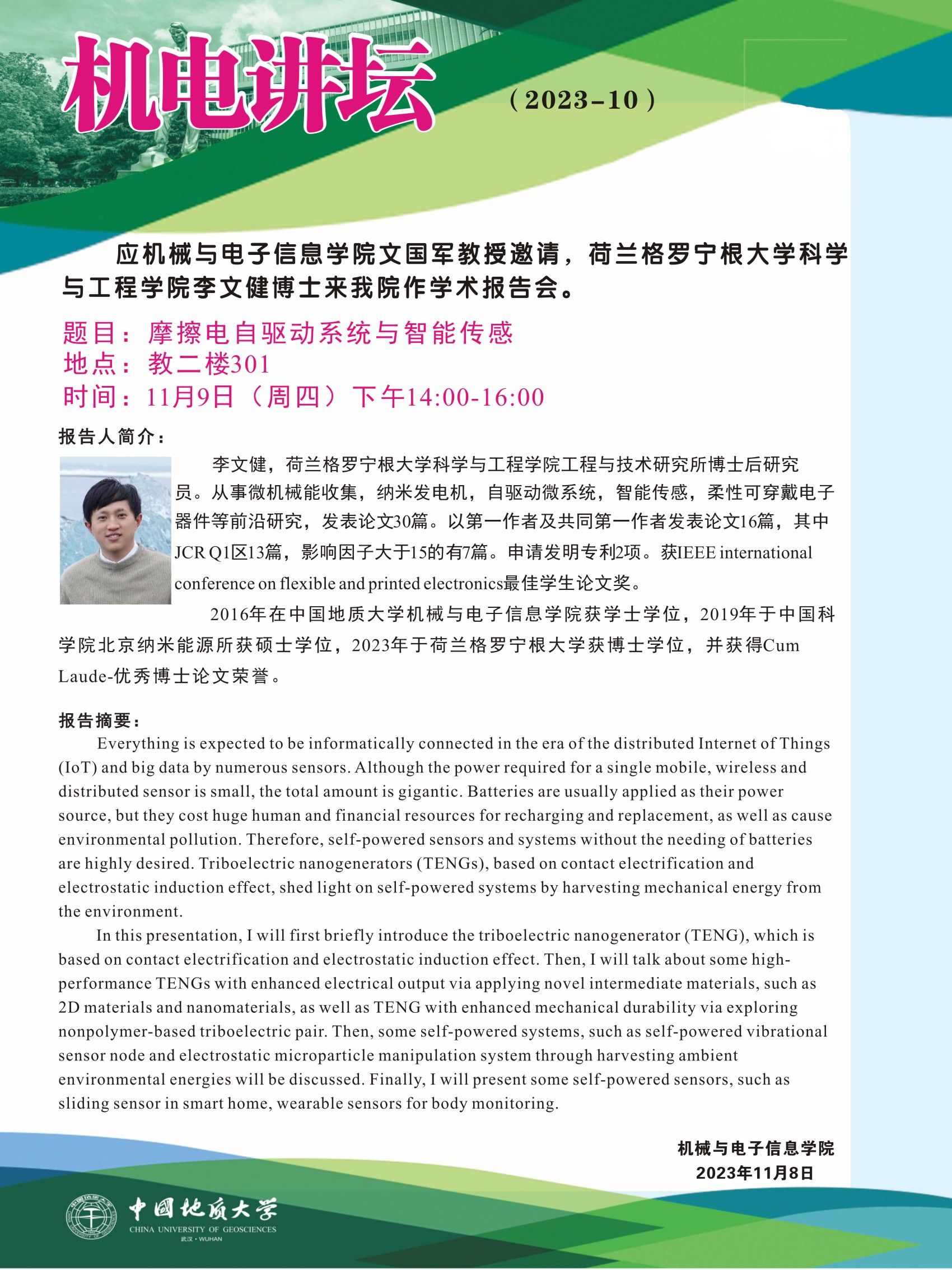 【11月9日】机电讲坛(2023-10):荷兰格罗宁根大学科学与工程学院李文健博士来我院作学术报告会