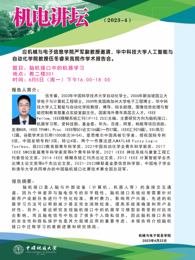 【6月5日】机电讲坛(2023-4:华中科技大学人工智能与自动化学院教授伍冬睿来我院作学术报告会