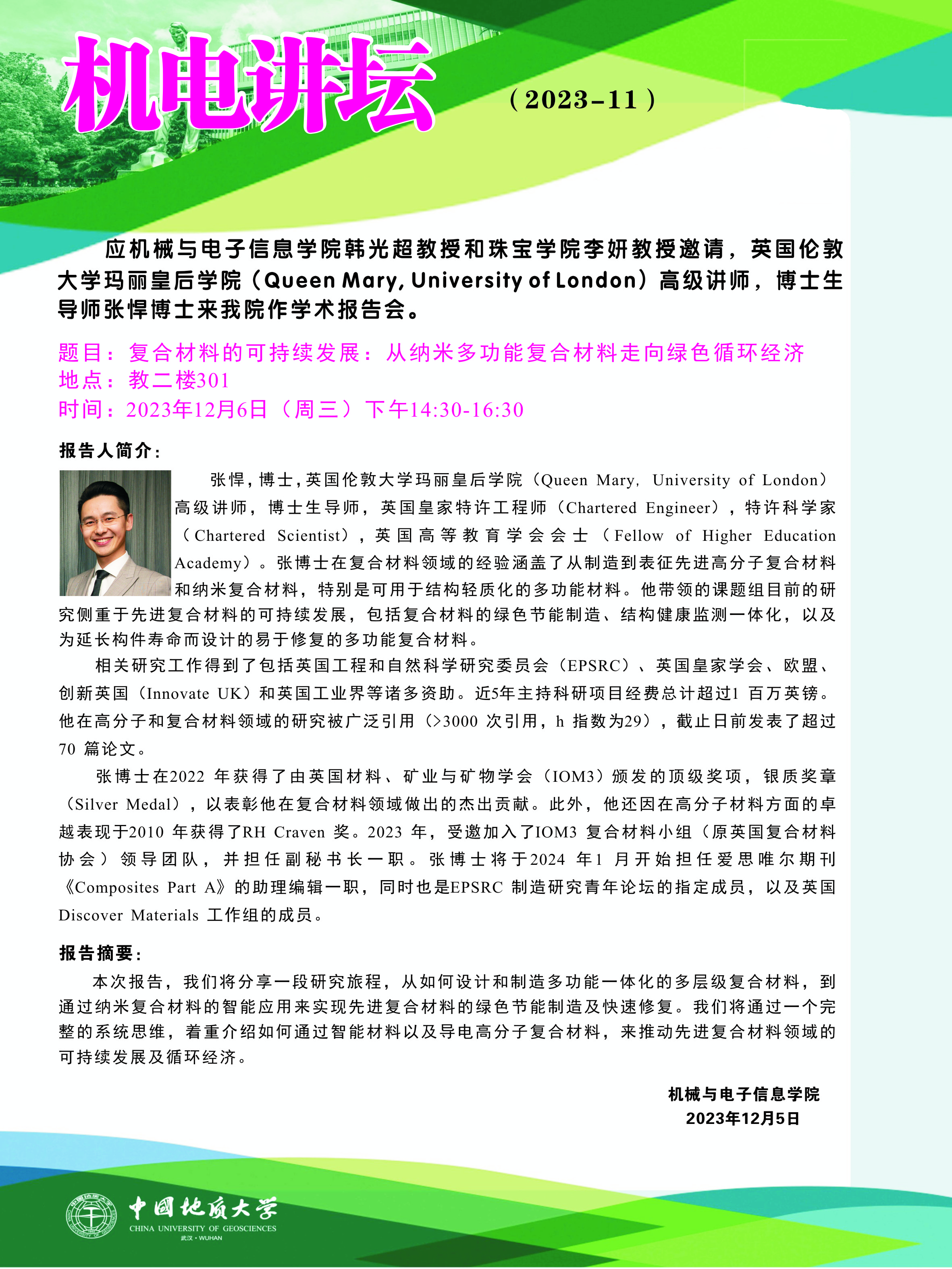 【12月6日】机电讲坛(2023-11):英国伦敦大学玛丽皇后学院张悍博士来我院作学术报告会