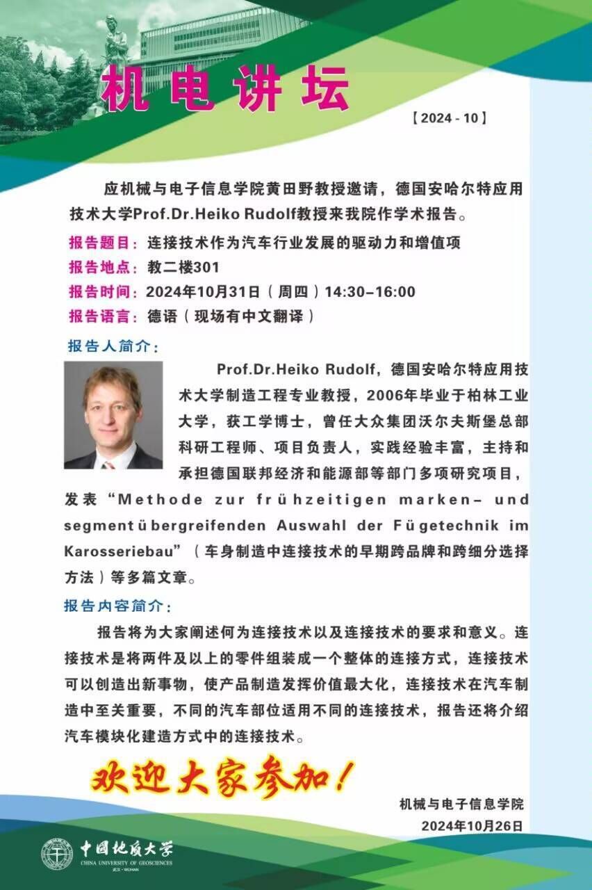 【10月31日】机电讲坛(2024-10):德国安哈尔特应用技术大学Prof.Dr.Heiko Rudolf教授来我院作学术报告