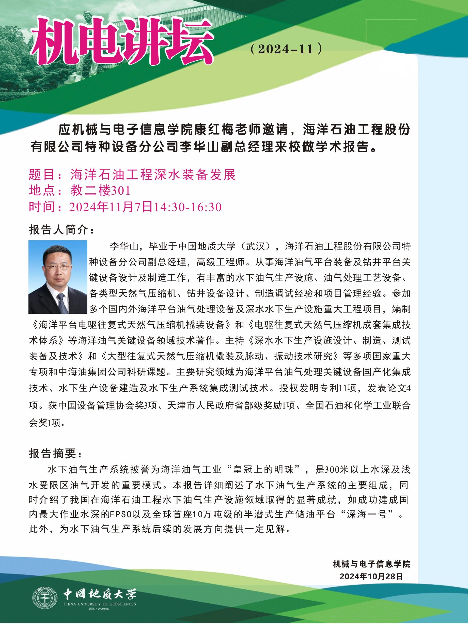 【11月7日】机电讲坛(2024-11):海洋石油工程股份有限公司特种设备分公司李华山副总经理来我院作学术报告