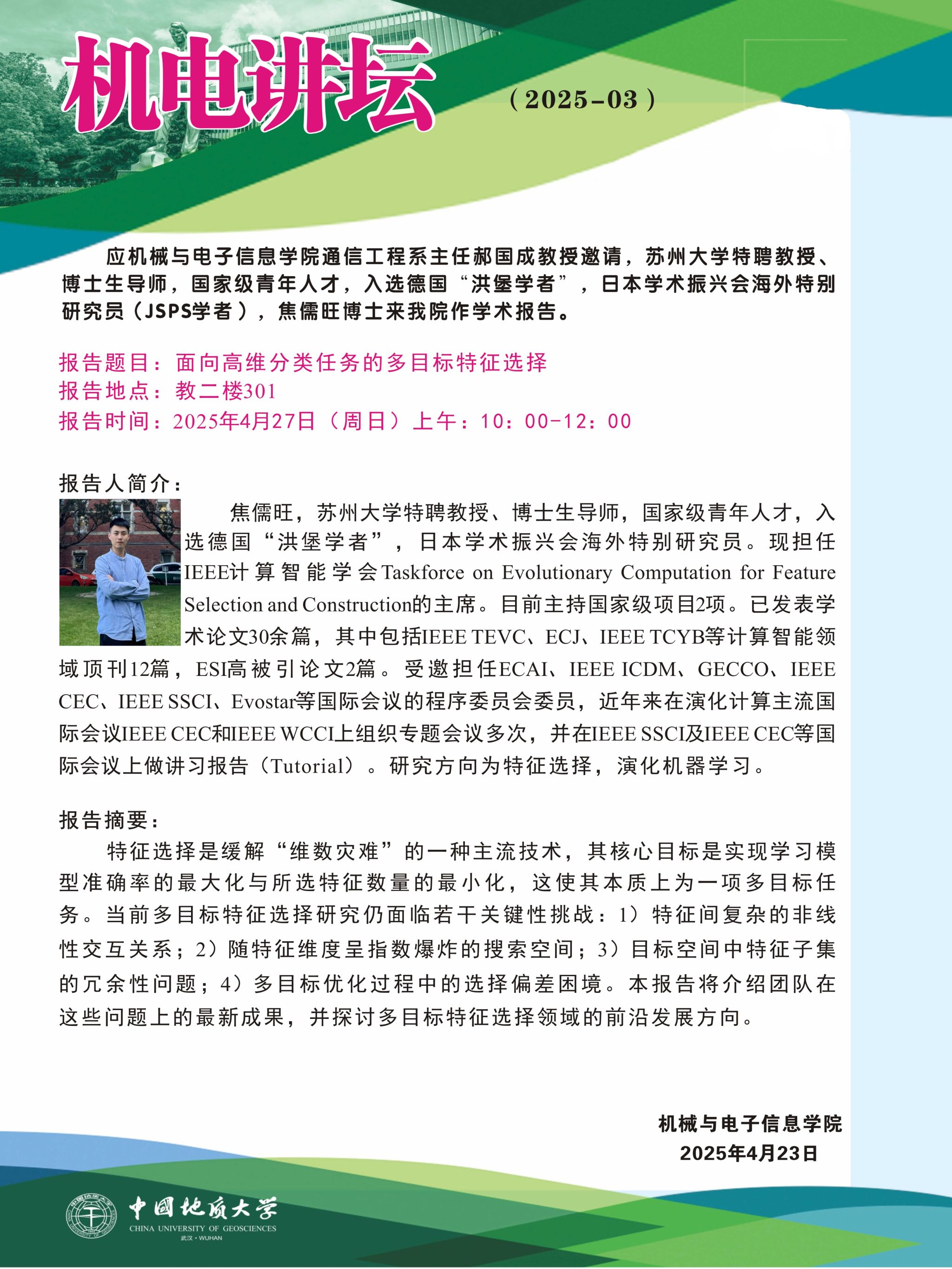 【4月27日】机电讲坛(2025-03)苏州大学特聘教授焦儒旺博士来我院作学术报告