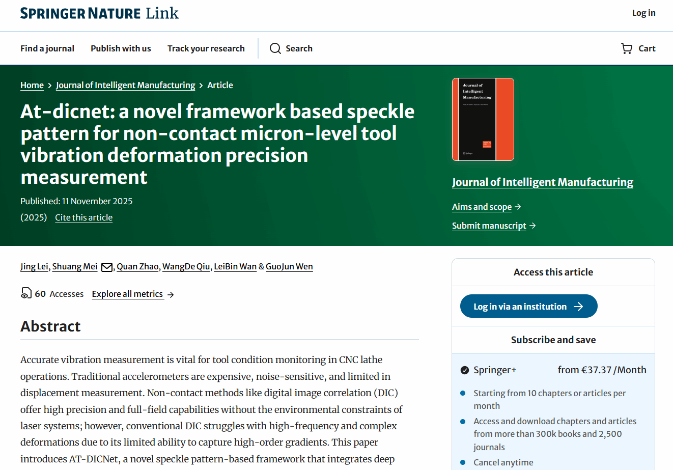 近日,我院梅爽教授、文国军教授科研团队在制造装备监测领域取得重要进展,成功研发基于数字图像相关(DIC)的非接触式刀具振动变形高精度测量系统。相关成果“AT-DICNet: A Novel Framework based on Speckle Pattern for Non-contact Micron-level Tool Vibration Deformation Precision Measurement”发表于国际权威期刊《Journal of Intelligent Manufacturing》,该论文第一作者为2022级研究生雷靖,梅爽教授为通讯作者。