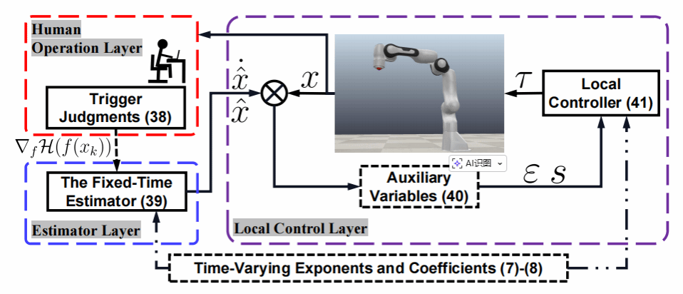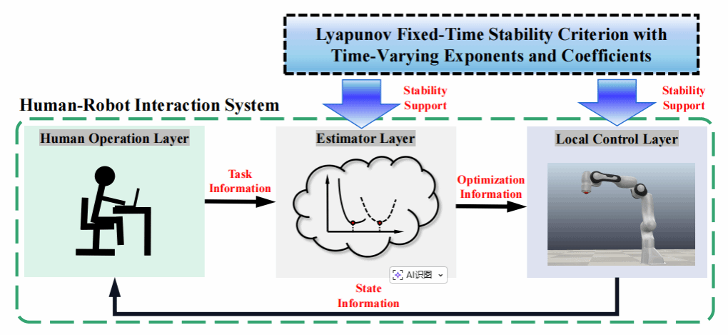 近日,我校BBIN宝盈集团葛明峰教授团队(付智辉、葛明峰、丁腾飞)与华中科技大学人工智能与自动化学院刘智伟教授团队合作的最新研究成果“Task optimization for fixed-time control of intermittent human-robot interaction with time-varying exponents and coefficients”被国际主流期刊《IEEE Transactions on Cybernetics》(2026年1月26日最新影响因子10.5,最新学校分区为T1)在线发表(DOI:10.1109/TCYB.2026.3650907)。该文提出了一种分层固定时间事件触发优化(Hierarchical Fixed-Time Event-Triggered Optimization,HFTEO)算法,旨在提升人类与机器人在动态环境中协作任务的效率与安全性。随着人工智能和机器人技术的快速发展,人机协作系统在工业、医疗、服务等多个领域的应用日益广泛。传统的机器人控制系统通常依赖于精确的指令与数据输入,但在实际应用中,人类操作员的决策往往是不确定和变化的,这对机器人的稳定性和任务执行效率提出了更高的要求。传统的任务优化方法往往依赖于连续和稳定的操作环境,但实际的人机交互通常是间歇性的,且存在不确定性,例如人类操作员的反应时间延迟、意图变化以及机器人控制的响应能力等。这使得如何在不确定的交互环境中确保任务的高效完成,成为一个亟待解决的技术难题。