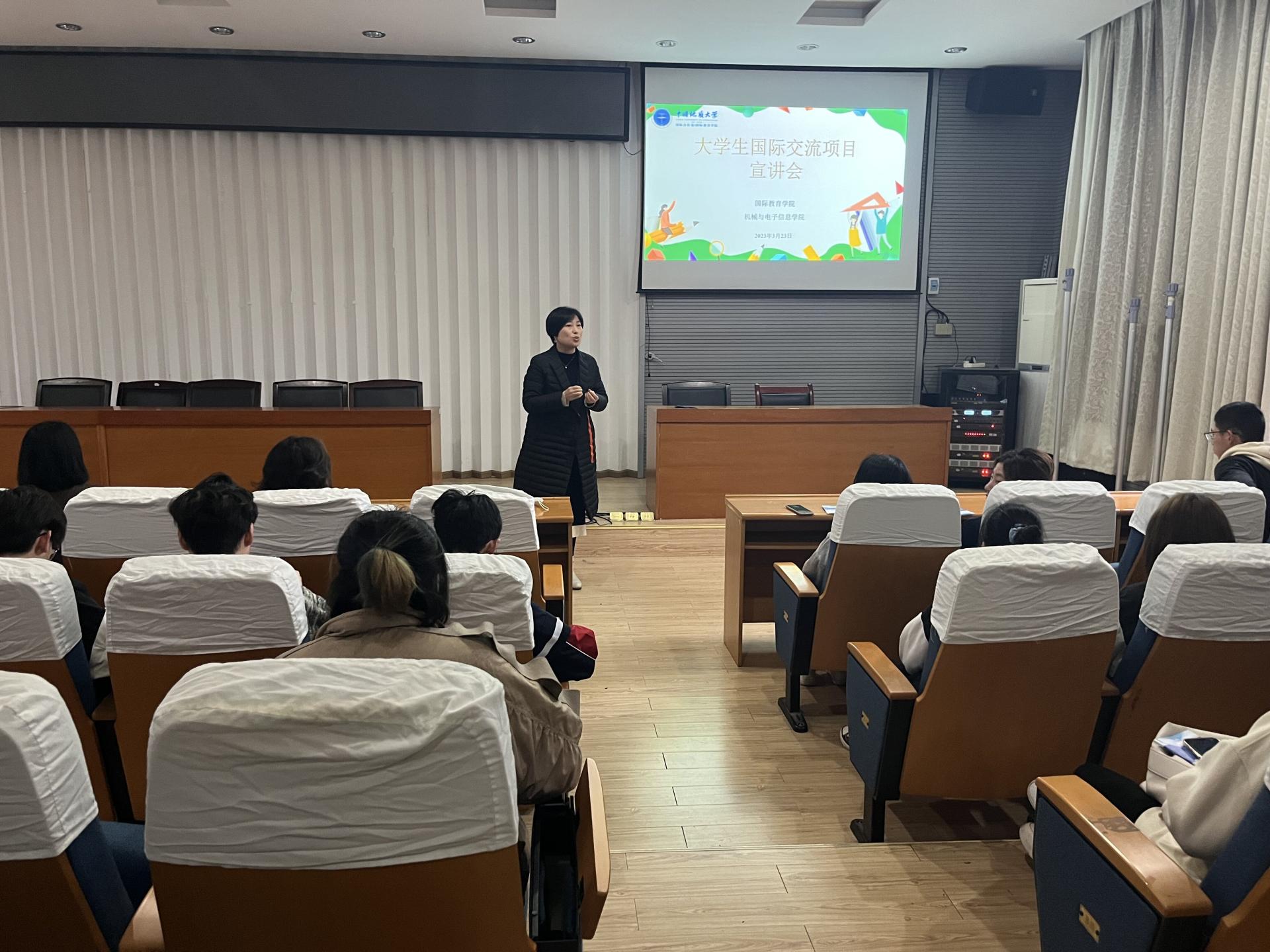 国际教育学院李梦宇老师介绍了学校国际化现状、国际教育学院工作职能、我校大学生国际交流项目类型、参加我校大学生国际交流项目必备的条件及准备工作,并为学生们详细讲解了如何进行出国时间规划。