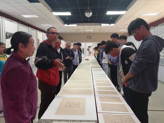 参观过程中,离退休教职工赵俊明、曾佐勋、孙立鹏、杨筠、刘国萍等不时同学生党员们深入交流,并结合展示作品进行了生动翔实的讲解。长达30米, 72页15000余字的长篇书法作品《共产党宣言》展现离退休教职工对党、对祖国、对学校的热爱和敬意;意境深刻的校庆对联讲述了学校的创建历史、概括了学校发展奋斗历程;曾佐勋教授现场朗诵散文作品深情表达了八方才俊建设地大铸就辉煌、大师学者走出地大回报社会的动人故事……一幅幅书法作品、一张张摄影图片、一件件手工文创,丰富的实物陈列吸引了学生党员们的目光,生动的讲述加深了他们对地大光辉历程的了解,激励他们要时刻发挥先锋模范作用,弘扬优良传统,更好地秉承艰苦朴素、求真务实的校训精神。