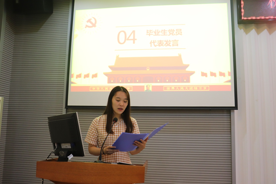 优秀毕业生党员代表张依依同学代表全体毕业生党员发言。她结合自己成长为一名合格的共产党员的历程,对党组织、学校的培养表达了感恩之情。她说道,在大学四年间,通过参与学校开展的培训学习,投身各项志愿服务工作,不断加强了自身的建设。在未来的工作生活中,会接受社会的监督和磨练,坚定前进信心,立大志、明大德、成大才、担大任,努力成为堪当民族复兴重任的时代新人,让青春在为祖国、为民族、为人民、为人类的不懈奋斗中绽放绚丽之花。