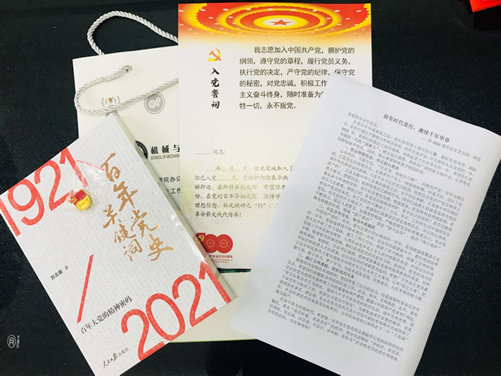 瞿祥华代表学院党委向2021届毕业生党员代表赠送毕业生党员纪念礼包。礼包以“学党史、强信念、跟党走”为主题,由包括党史主题学习教材、毕业生党员专属贺卡、致2021届毕业生党员的一封信在内的5件礼物组成。