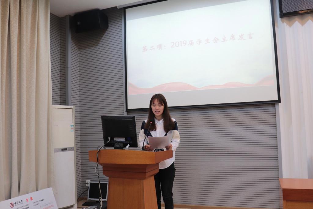 接下来由2019届学生会主席张依依进行发言,她对学生会工作的职能与目的进行了深入解读,也指出了学生会之后的工作改革与发展规划,提出要“不断强化服务意识,勇于开阔自身视野,加强与外企的联系,扩展新资源”。并在最后引用了习近平总书记的“我将无我,不负人民”生动的指出了学生会“不负初心,不服同学”的宗旨。