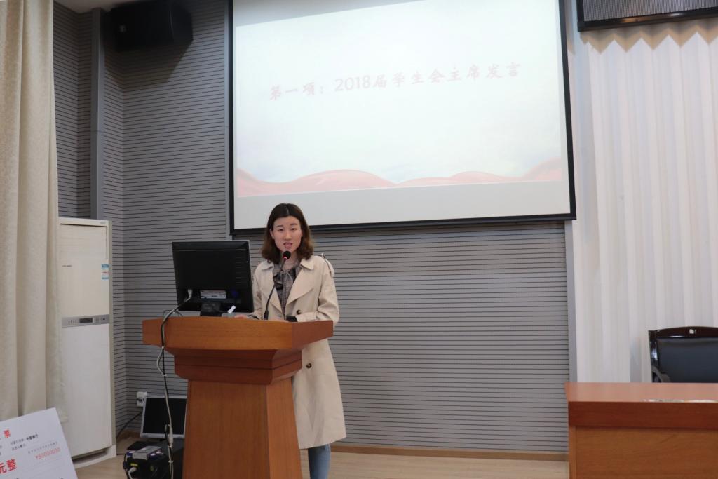 会议进行第一项,由2018届学生会主席乔婧发言。她提及了学生会2018年以来的活动与工作,细数了学生会工作所取得的成就与荣誉,也谈及了之后学生会的发展机遇与挑战,指出了几点学生会服务同学不忘初心的宗旨。最后主席乔婧表达了对学生会殷切的希望与祝福。
